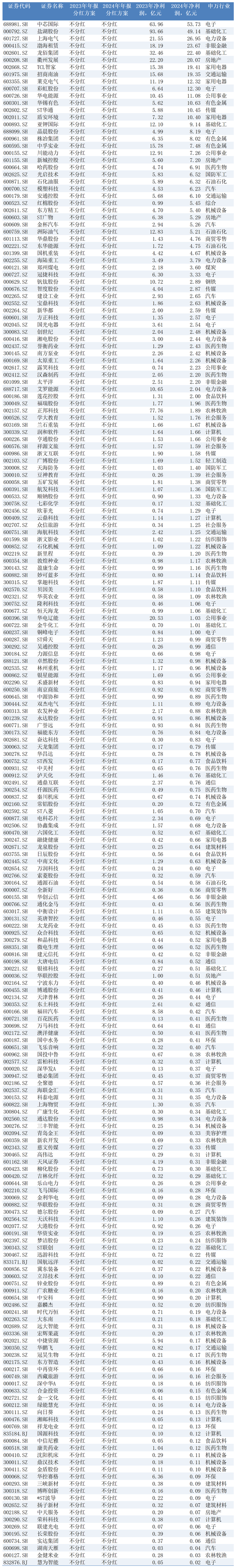 2023年年报和2024年年报,连续两年不分红,这样的公司共有1205家。这1205家公司的行业分布如下: